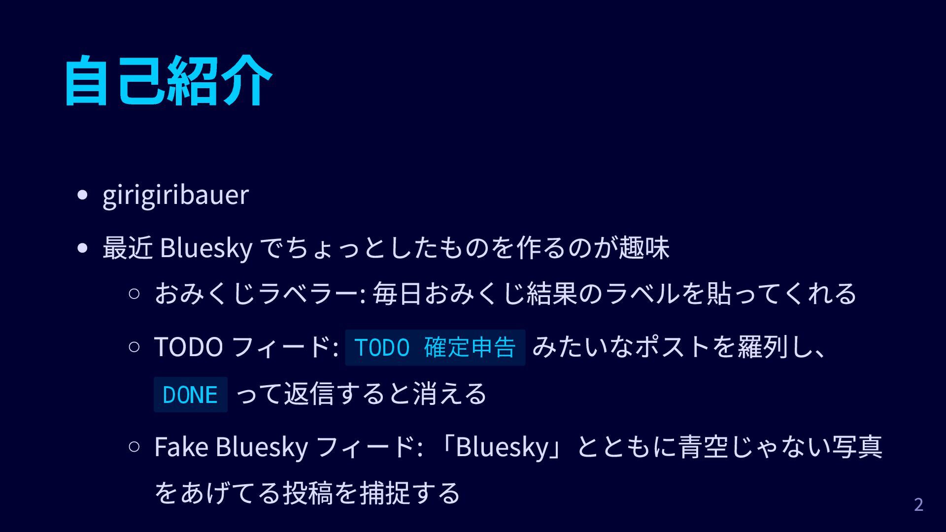 自己紹介 girigiribauer 最近 Bluesky でちょっとしたものを作るのが趣味 おみくじラベラー: 毎日おみくじ結果のラベルを貼ってくれる TODO フィード: TODO
