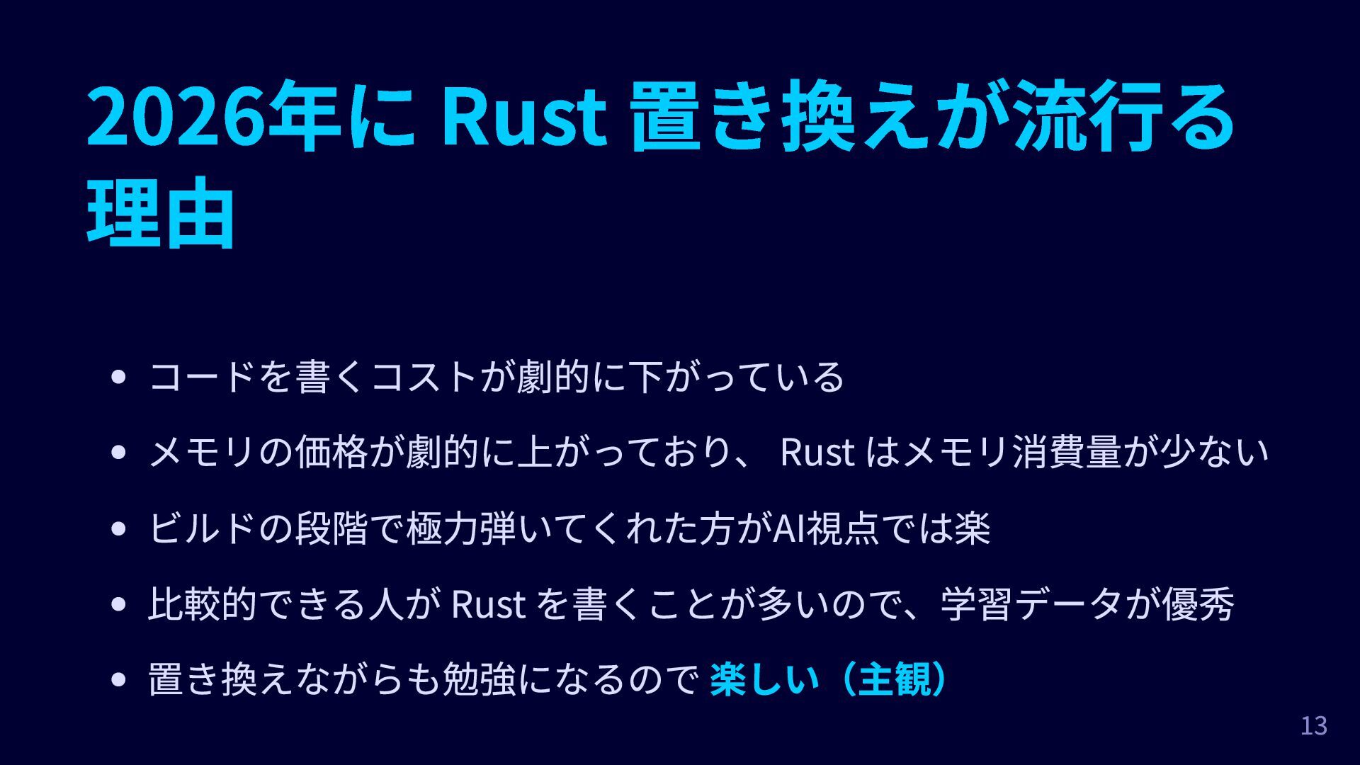 2026年に Rust 置き換えが流行る 理由 コードを書くコストが劇的に下がっている メモリの価格が劇的に上がっており、 Rust はメモリ消費量が少ない ビルドの段階で極力弾いてくれた方がAI視点では楽 比較的できる人が