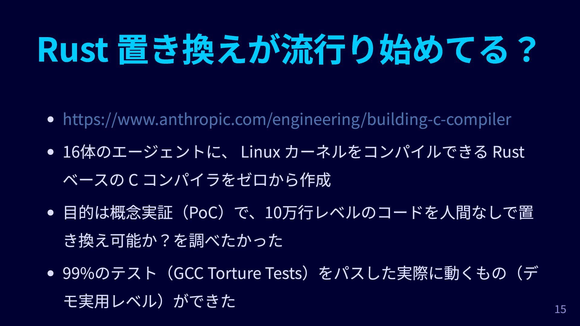 目的は概念実証(PoC)で、10万行レベルのコードを人間なしで置 き換え可能か?を調べたかった 99%のテスト(GCC Torture Tests)をパスした実際に動くもの(デ モ実用レベル)ができた 15