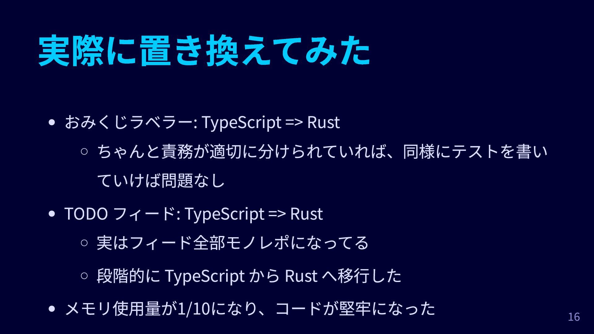 => Rust 実はフィード全部モノレポになってる 段階的に TypeScript から Rust へ移行した メモリ使用量が1/10になり、コードが堅牢になった 16