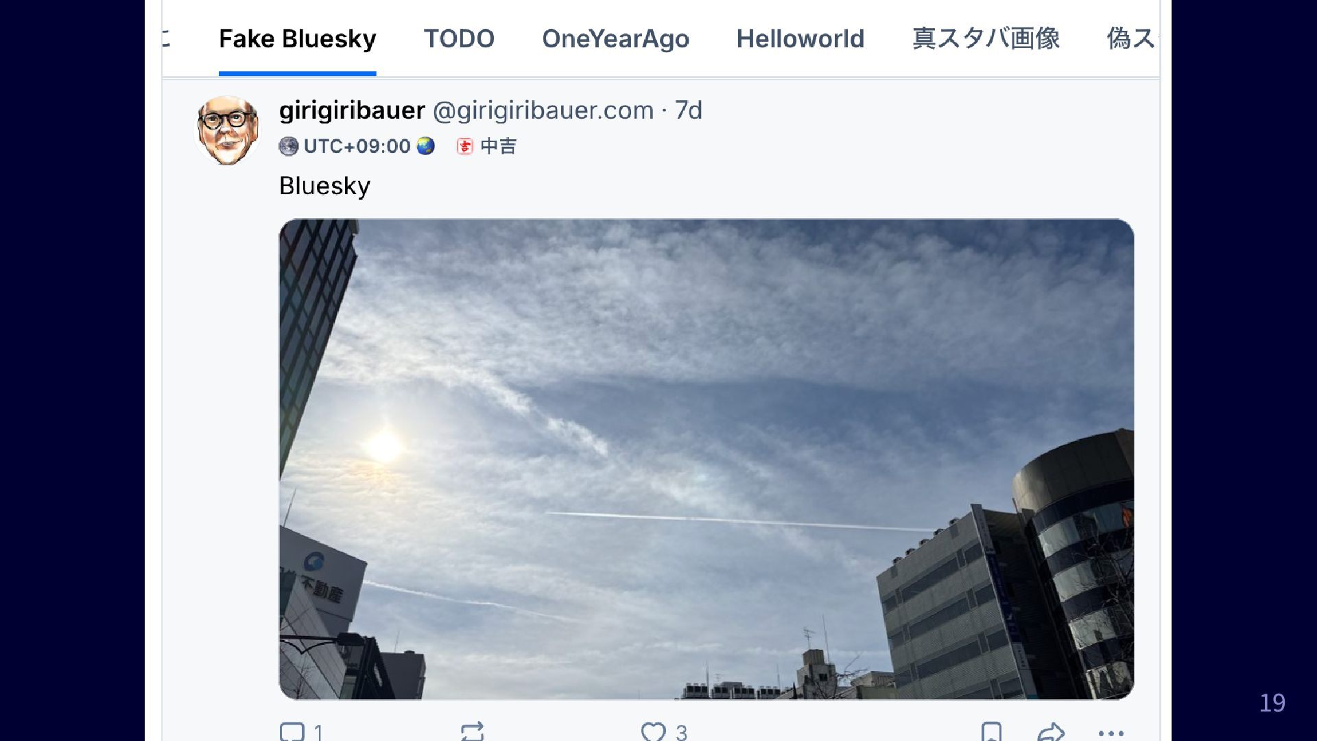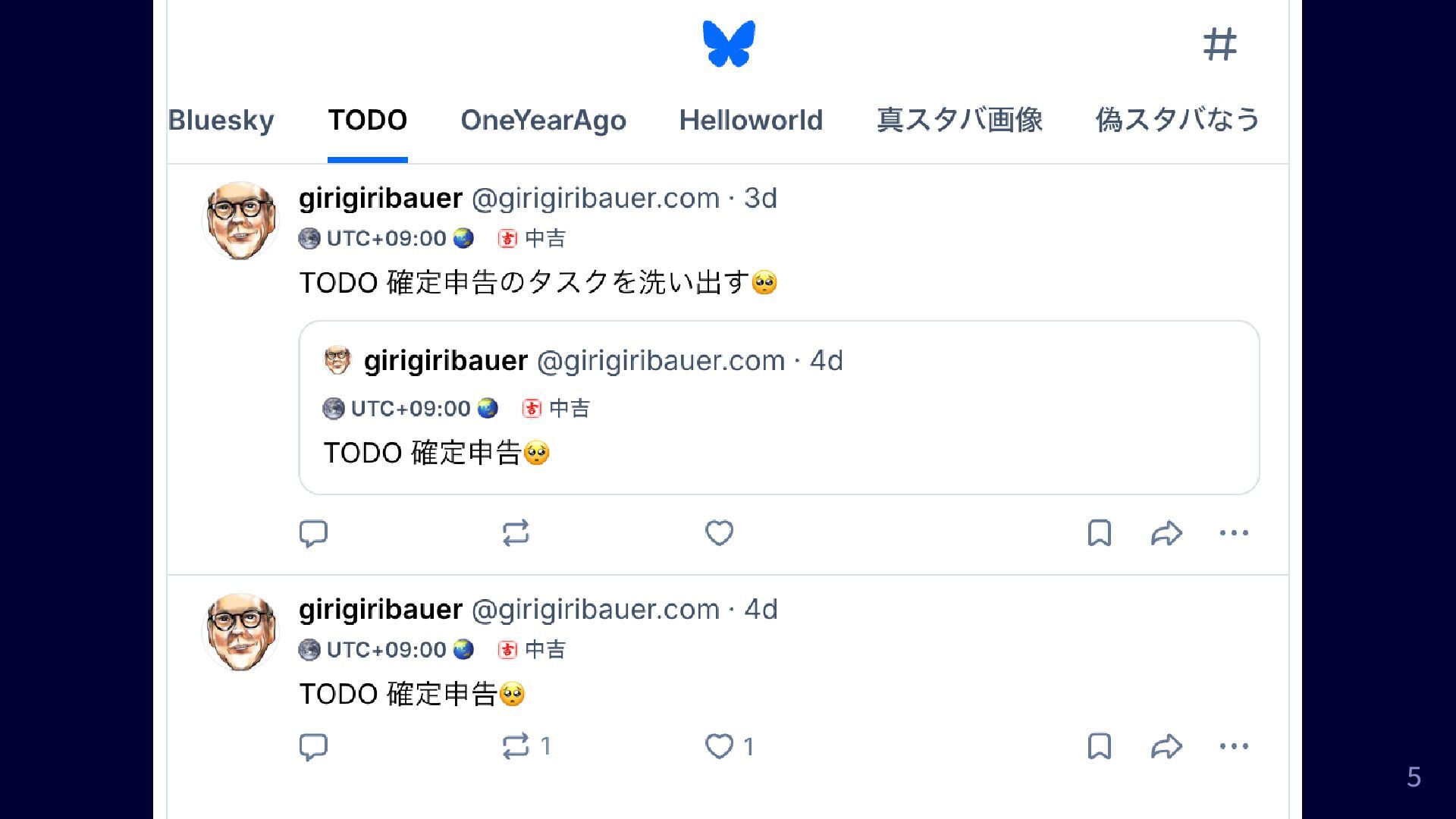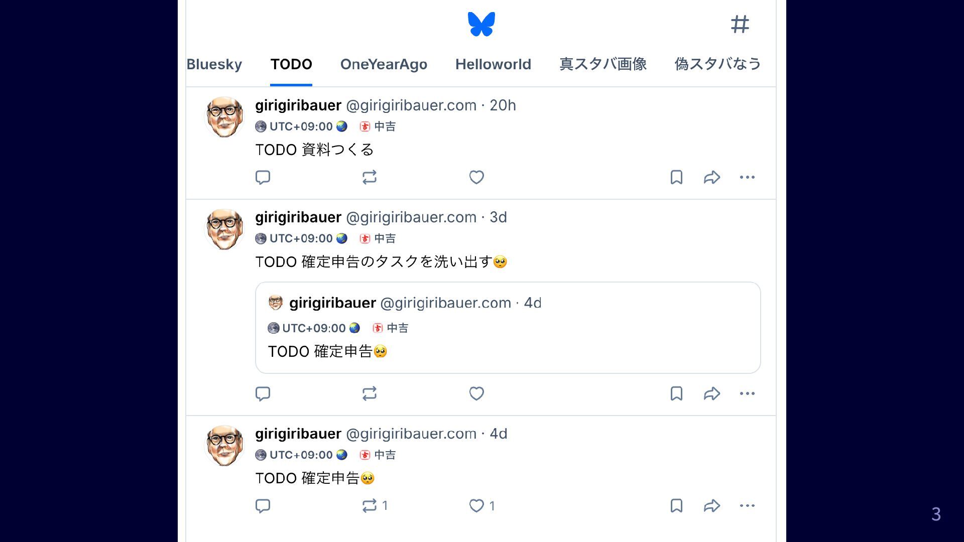 確定申告 みたいなポストを羅列し、 DONE って返信すると消える Fake Bluesky フィード: 「Bluesky」とともに青空じゃない写真 をあげてる投稿を捕捉する 2