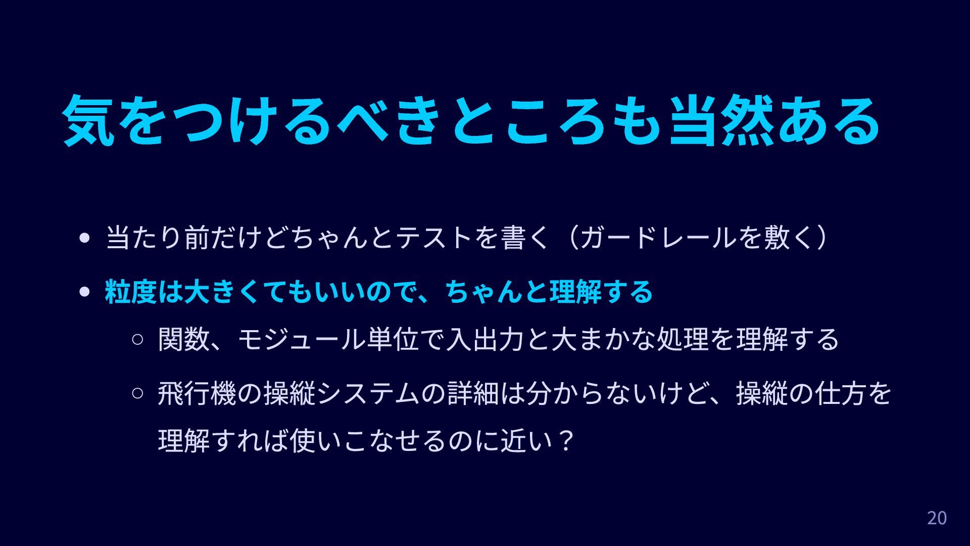 気をつけるべきところも当然ある 当たり前だけどちゃんとテストを書く(ガードレールを敷く) 粒度は大きくてもいいので、ちゃんと理解する 関数、モジュール単位で入出力と大まかな処理を理解する 飛行機の操縦システムの詳細は分からないけど、操縦の仕方を 理解すれば使いこなせるのに近い? 20