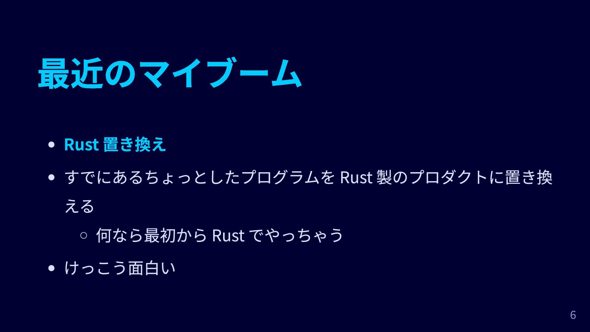 最近のマイブーム Rust 置き換え すでにあるちょっとしたプログラムを Rust 製のプロダクトに置き換 える 何なら最初から Rust でやっちゃう