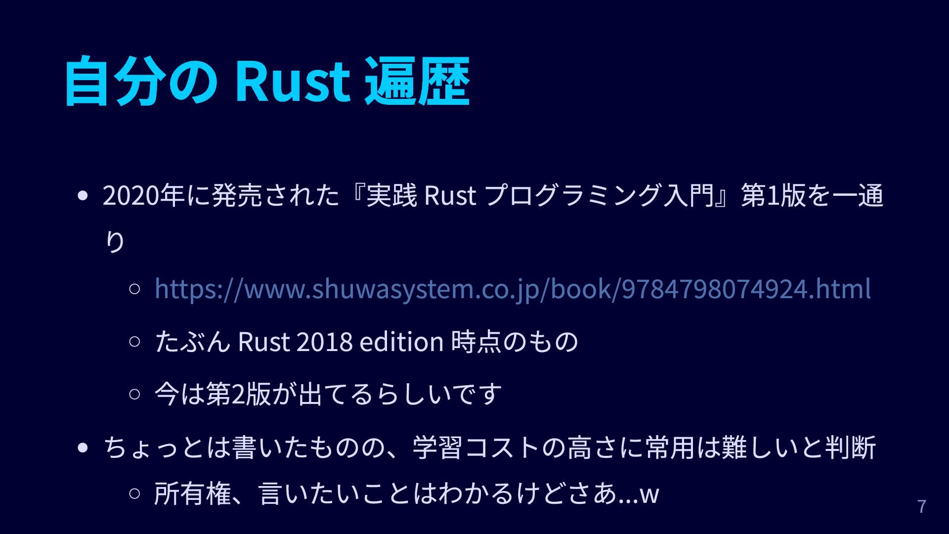 自分の Rust 遍歴 2020年に発売された『実践 Rust プログラミング入門』第1版を一通 り https://www.shuwasystem.co.jp/book/9784798074924.html たぶん Rust