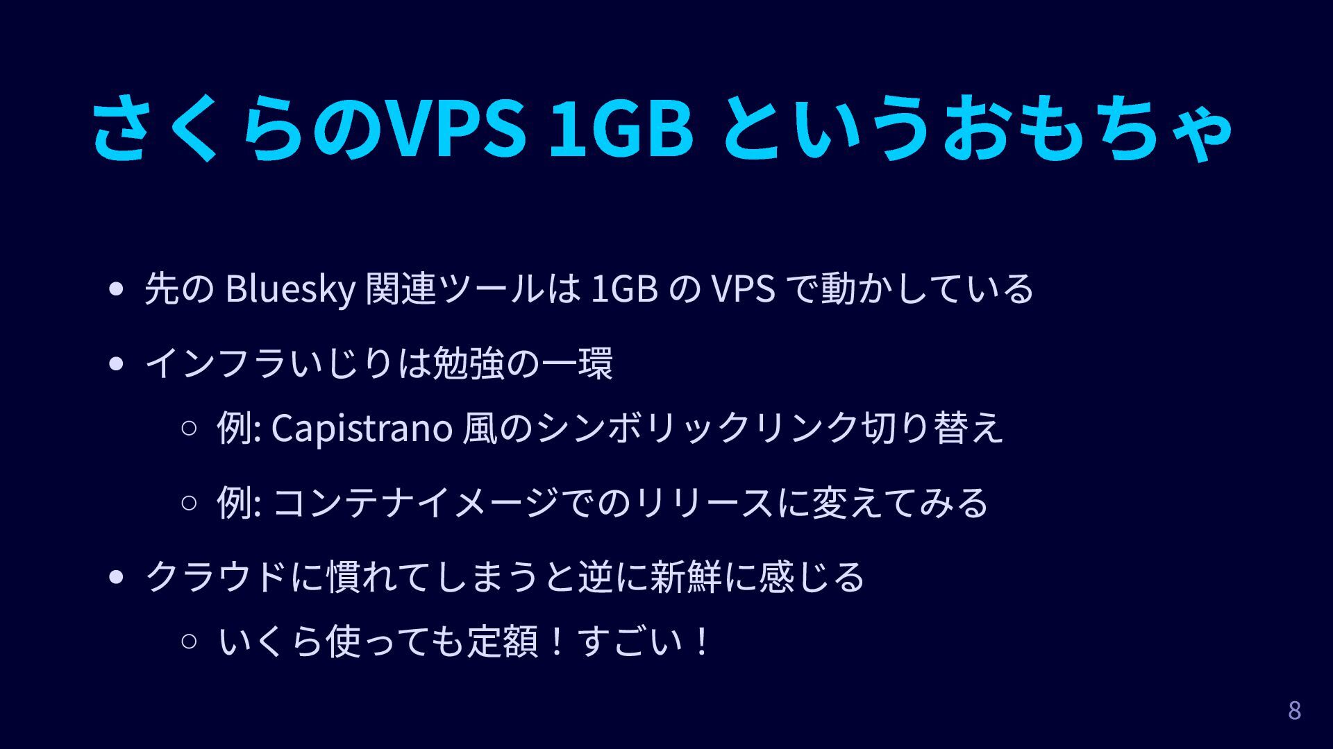 インフラいじりは勉強の一環 例: Capistrano 風のシンボリックリンク切り替え 例: コンテナイメージでのリリースに変えてみる クラウドに慣れてしまうと逆に新鮮に感じる いくら使っても定額!すごい! 8