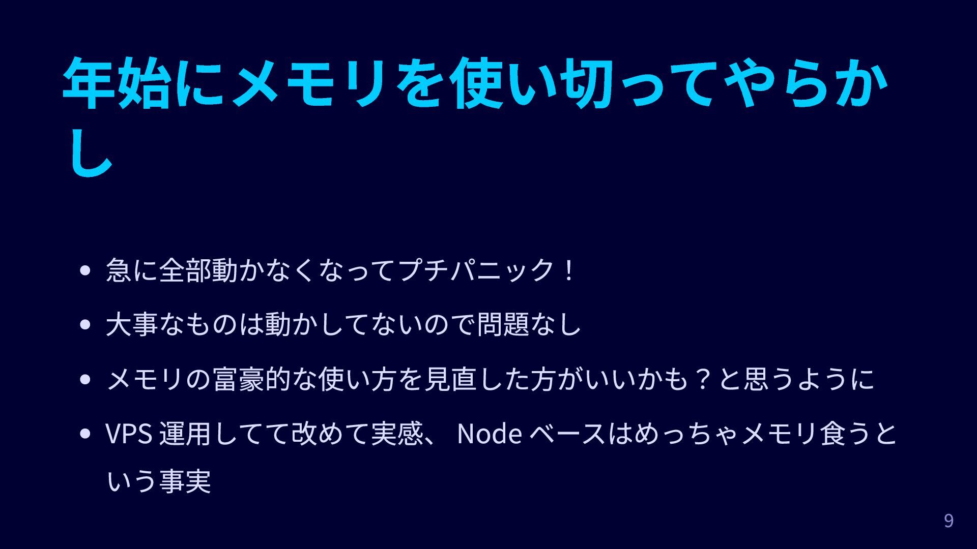 年始にメモリを使い切ってやらか し 急に全部動かなくなってプチパニック! 大事なものは動かしてないので問題なし メモリの富豪的な使い方を見直した方がいいかも?と思うように VPS 運用してて改めて実感、 Node ベースはめっちゃメモリ食うと いう事実