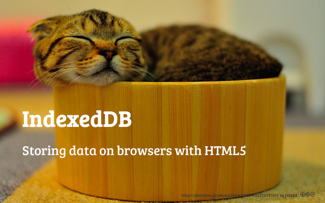x e d D B ) { v a r r e q = i n d e x e d D B . o p e n ( ' m y D a t a b a s e ' ) ; / / a s y n c c a l l b a c k s r e q . o n s u c c e s s = f u n c t i o n ( e ) { . . . } ; . . . } 16