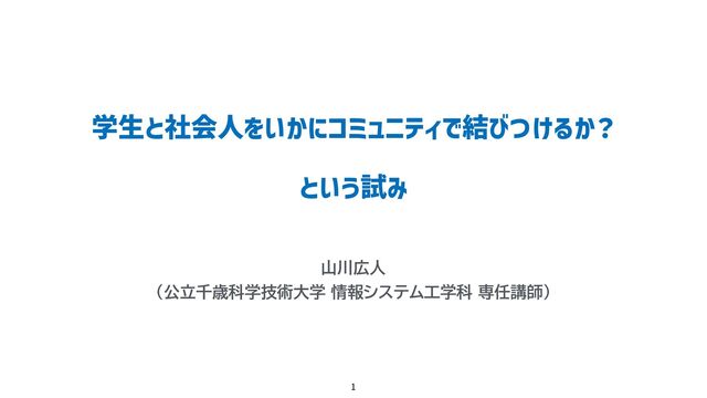 学⽣と社会⼈をいかにコミュニティで結びつけるか? という試み 山川広人 (公立千歳科学技術大学 情報システム工学科 専任講師) 1