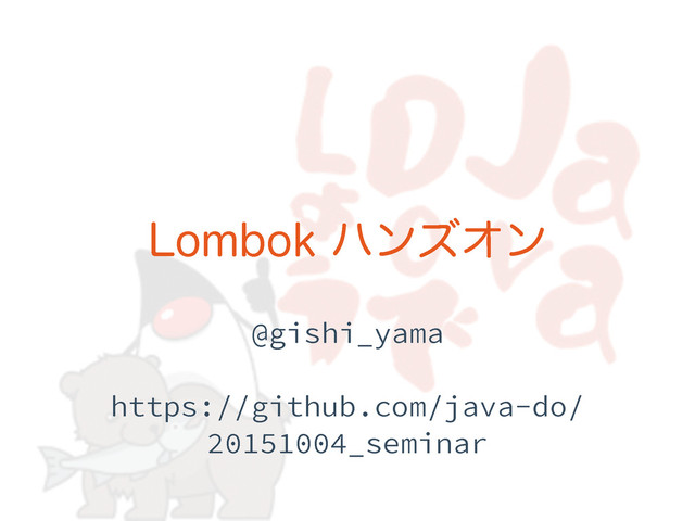 that know how to build and compile simple, boilerplate-free, not- quite-java code.” 1SPKFDU-PNCPL IUUQTHJUIVCDPNS[XJUTFSMPPUMPNCPL LombokJavaʹ’ϋϯυϥ’ΛՃ͢Δ͜ͱͰɺJavaΛؾͷར͍ͨ ݴޠʹ͢ΔΑʂ ϋϯυϥ ɾγϯϓϧͰ ɾϘΠϥʔϓϨʔτʢ͓͖·Γͷॻ͖ํʣΛ·͵͕ΕΔ ɾJavaͬΆ͘ͳ͍ ίʔυʹ͢ΔϏϧυίϯύΠϧͷํ๏ΛѲ͍ͯ͠ΔͷͩΑʂ
