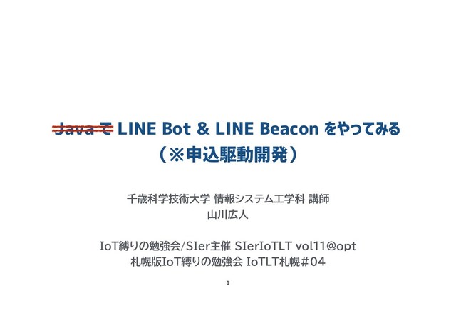 Beacon ◦◦教授室 まだn分ぐらいかかる ① ② ※うまくいったらオープンキャンパスで施設紹介システムとかにもできそう ※学生からは学内にBeaconをばらまいて、ボスの入退室や場所をリアルタイム把握したいとの声もあるが 行動トラッキングはいろいろアレすぎるのでこのぐらいから ① 教員による期間予定の送信 (RichMenu/LIFFなど) ⇒個人的にはスマートスピーカーで入力もしたい(IoT感増したい) ② 学生が教員室の前でLINEアプリを開くとBeaconEvent受信 ③ BeaconEventのCallbackとして帰室予定を定時 ◦◦教授Bot ◦◦教授はxx:xx頃戻ります ③ ここをやったことなかったので やってみたのが今日の話
