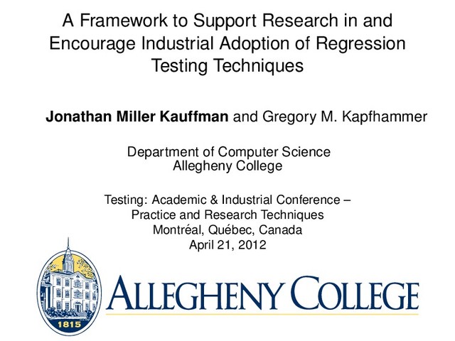 of Regression Testing Techniques Jonathan Miller Kauffman and Gregory M. Kapfhammer Department of Computer Science Allegheny College Testing: Academic & Industrial Conference – Practice and Research Techniques Montr´ eal, Qu´ ebec, Canada April 21, 2012
