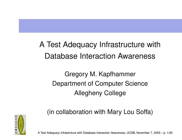 Kapfhammer Department of Computer Science Allegheny College (in collaboration with Mary Lou Soffa) A Test Adequacy Infrastrcture with Database Interaction Awareness, UCSB, November 7, 2005 – p. 1/35
