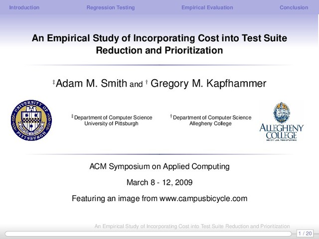 Incorporating Cost into Test Suite Reduction and Prioritization ‡Adam M. Smith and † Gregory M. Kapfhammer ‡Department of Computer Science University of Pittsburgh †Department of Computer Science Allegheny College ACM Symposium on Applied Computing March 8 - 12, 2009 Featuring an image from www.campusbicycle.com 1 / 20 An Empirical Study of Incorporating Cost into Test Suite Reduction and Prioritization