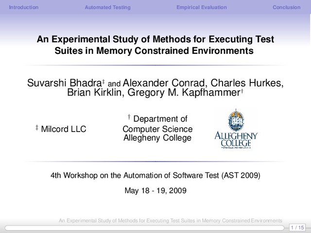 Methods for Executing Test Suites in Memory Constrained Environments Suvarshi Bhadra‡ and Alexander Conrad, Charles Hurkes, Brian Kirklin, Gregory M. Kapfhammer† ‡ Milcord LLC † Department of Computer Science Allegheny College 4th Workshop on the Automation of Software Test (AST 2009) May 18 - 19, 2009 1 / 15 An Experimental Study of Methods for Executing Test Suites in Memory Constrained Environments