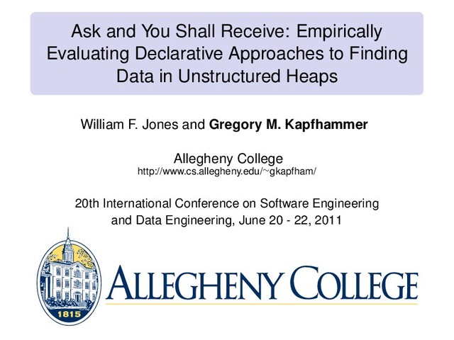 Finding Data in Unstructured Heaps Challenges Solutions Benchmarking Framework Jones & Kapfhammer Allegheny College Ask and You Shall Receive: Empirically Evaluating Declarative Approaches to Finding Data in Unstructured Heaps