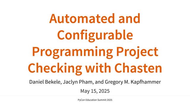 efficient, readable code Manual project review is time-consuming and error-prone Many courses face these challenges: Data structures Algorithm analysis Software engineering Existing tools focus on style, not semantic structure Regex is brittle, and AST tools are hard to prototype Project Goal: Chasten enables scalable and structure-aware feedback that effectively supports both instructors and students PyCon Education Summit 2025