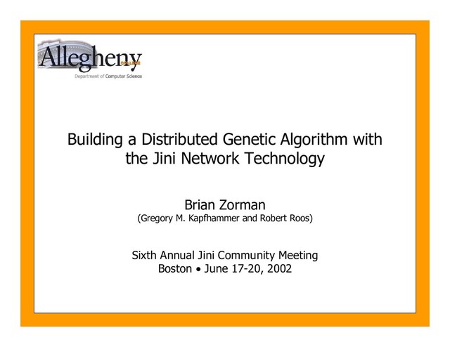 to build a distributed genetic algorithm • Proposed, implemented, and empirically evaluated a simple and a complex distributed system model (SDSM and CDSM) • SDSM bottleneck was a serious concern that prompted the investigation of a new model that removed JavaSpaces interaction bottlenecks • CDSM outperformed SGA in quality of solution, diversity, and generations per second • SGA only outperformed CDSM in execution time (mostly due to early convergence)