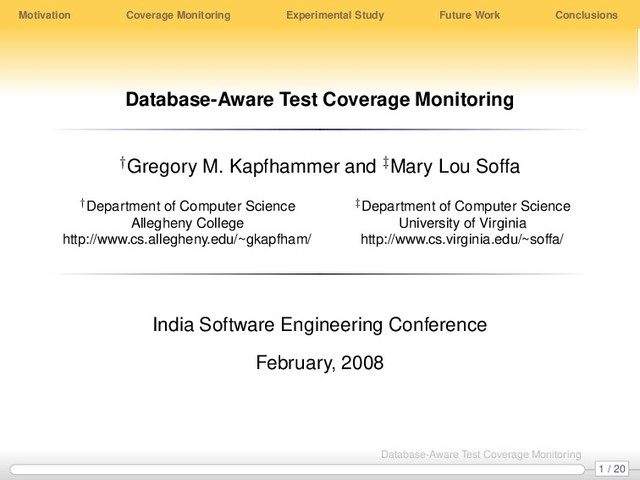 Coverage Monitoring †Gregory M. Kapfhammer and ‡Mary Lou Soffa †Department of Computer Science Allegheny College http://www.cs.allegheny.edu/~gkapfham/ ‡Department of Computer Science University of Virginia http://www.cs.virginia.edu/~soffa/ India Software Engineering Conference February, 2008 1 / 20 Database-Aware Test Coverage Monitoring