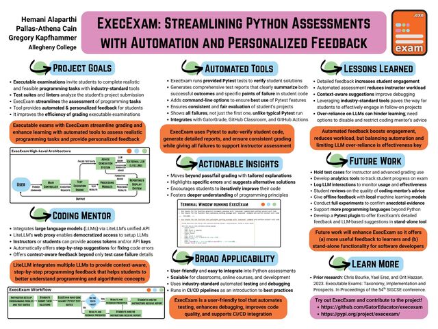 and ensure consistent grading while giving all failures to support instructor assessment Learn More Executable exams with ExecExam streamline grading and enhance learning with automated tools to assess realistic programming tasks and provide personalized feedback Project Goals Automated Tools Coding Mentor Moves beyond pass/fail grading with tailored explanations Highlights specific errors and suggests alternative solutions Encourages students to iteratively improve their code Fosters deeper understanding of programming principles Integrates large language models (LLMs) via LiteLLM’s unified API LiteLLM’s web proxy enables democratized access to setup LLMs Instructors or students can provide access tokens and/or API keys Automatically offers step-by-step suggestions for fixing code errors Offers context-aware feedback beyond only test case failure details Terminal Window running ExecExam Detailed feedback increases student engagement Automated assessment reduces instructor workload Context-aware suggestions improve debugging Leveraging industry-standard tools paves the way for students to effectively engage in follow-on projects Over-reliance on LLMs can hinder learning; need options to disable and restrict coding mentor’s advice User-friendly and easy to integrate into Python assessments Scalable for classrooms, online courses, and development Uses industry-standard automated testing and debugging Runs in CI/CD pipelines as an introduction to best practices LiteLLM integrates multiple LLMs to provide context-aware, step-by-step programming feedback that helps students to better understand programming and algorithmic concepts ExecExam: Streamlining Python Assessments with Automation and Personalized Feedback Future Work Executable examinations invite students to complete realistic and feasible programming tasks with industry-standard tools Test suites and linters analyze the student’s project submission ExecExam streamlines the assessment of programming tasks Tool provides automated & personalized feedback for students It improves the efficiency of grading executable examinations ExecExam runs provided Pytest tests to verify student solutions Generates comprehensive test reports that clearly summarize both successful outcomes and specific points of failure in student code Adds command-line options to ensure best use of Pytest features Ensures consistent and fair evaluation of student’s projects Shows all failures, not just the first one, unlike typical Pytest run Integrates with GatorGrade, GitHub Classroom, and GitHub Actions Hold test cases for instructor and advanced grading use Develop analytics tools to track student progress on exam Log LLM interactions to monitor usage and effectiveness Student reviews on the quality of coding mentor’s advice Give offline feedback with local machine learning models Conduct full experiments to confirm anecdotal evidence Support more programming languages beyond Python Develop a Pytest plugin to offer ExecExam’s detailed feedback and LLM-based suggestions in stand-alone tool Hemani Alaparthi Pallas-Athena Cain Gregory Kapfhammer ExecExam is a user-friendly tool that automates testing, enhances debugging, improves code quality, and supports CI/CD integration Automated feedback boosts engagement, reduces workload, but balancing automation and limiting LLM over-reliance is effectiveness key Future work will enhance ExecExam so it offers (a) more useful feedback to learners and (b) stand-alone functionality for software developers Prior research: Chris Bourke, Yael Erez, and Orit Hazzan. 2023. Executable Exams: Taxonomy, Implementation and Prospects. In Proceedings of the 54 SIGCSE conference. th Try out ExecExam and contribute to the project! https://github.com/GatorEducator/execexam https://pypi.org/project/execexam/ Actionable Insights Lessons Learned Broad Applicability Allegheny College