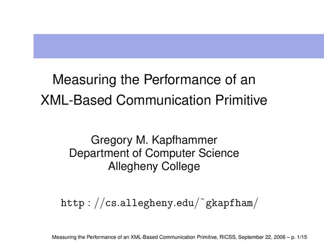 GHz P4, 1 GB main memory, 1 MB L1 Cache, CPU hyperthreading Use operating system and language-based timers to calculate R(B, P), R∆ (B, P, P ), and R% ∆ (B, P, P ) Replace the socket communication primitive with XML-RPC Execute ten trials and calculate arithmetic means, standard deviations, and confidence intervals Formulate the null hypothesis as H0 : µR(B,P) = µR(B,P ) Use the Welch’s approximate t-test with α = .01 Measuring the Performance of an XML-Based Communication Primitive, RICSS, September 22, 2006 – p. 8/15