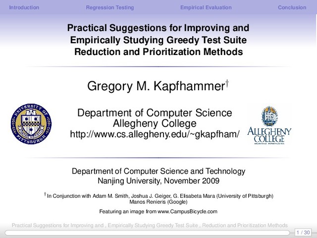 Random Number Input Output {1 , 2 , 3 , 4} 2 t1, t2, t3, |t4 t1, t4, t3, t2 {1 , 2 , 3} 3 t1, t4, |t3, t2 t1, t4, t3, t2 {1 , 2} 1 t1, |t4, t3, t2 t4, t1, t3, t2 Strategy: Use the modern and efficient implementation of the Fisher-Yates shuffle to produce the reordered test suite Tp = t4 , t1 , t3 , t2 18 / 30 Practical Suggestions for Improving and , Empirically Studying Greedy Test Suite , Reduction and Prioritization Methods