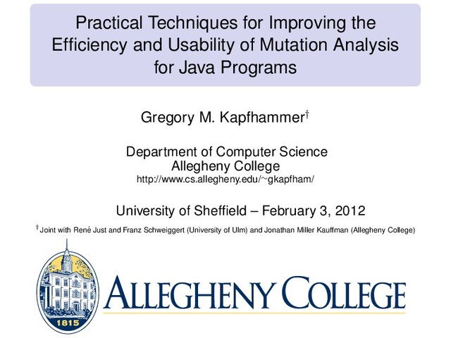 a Test Suite? T1 T2 T3 T4 T5 T6 T7 T8 T9 T10 Test Suite T = T1, T2, . . . , T9, T10 R1 R2 R3 R4 R5 R6 F1 F2 F3 F4 B1 B2 Requirements R = {R1 , . . . , R6 }, Features F = {F1 , . . . , F4 }, Bug Fixes B = {B1 , B2 } How Good is Test Suite T? Coverage Analysis Mutation Analysis Kapfhammer Allegheny College Practical Techniques for Improving the Efficiency and Usability of Mutation Analysis for Java Programs
