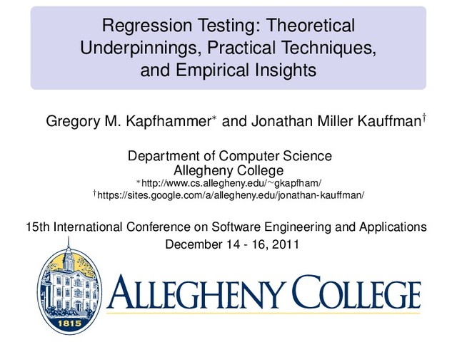 Importance of Test Suite Prioritization 0 5 10 15 0 1 2 3 4 5 Testing Time (l) Covered Test Requirements (C(T, l)) 3, 1, 2 CE = 0.5789 1,2,3 Test Orderings 1,2,3 1,3,2 1,2,3 1,3,2 2,3,1 1,2,3 1,3,2 2,3,1 3,1,2 Best ordering shows a higher effectiveness scores - CE = 0.5789 Kapfhammer and Kauffman Allegheny College Regression Testing: Theoretical Underpinnings, Practical Techniques, and Empirical Insights