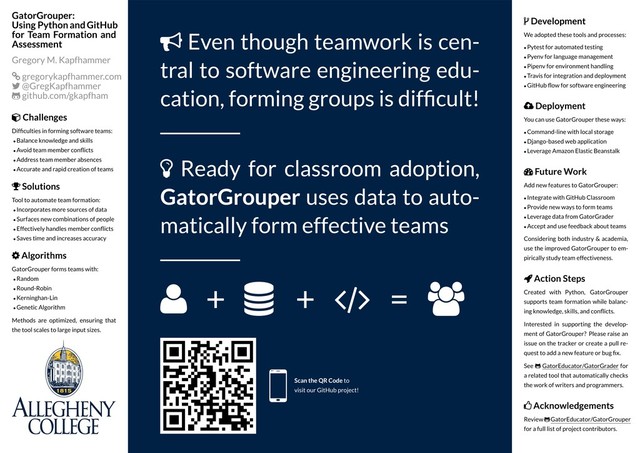 Kapfhammer gregorykapfhammer.com @GregKapfhammer github.com/gkapfham Ɨ Challenges Difficulties in forming software teams: • Balance knowledge and skills • Avoid team member conflicts • Address team member absences • Accurate and rapid creation of teams Solutions Tool to automate team formation: • Incorporates more sources of data • Surfaces new combinations of people • Effectively handles member conflicts • Saves time and increases accuracy Algorithms GatorGrouper forms teams with: • Random • Round-Robin • Kerninghan-Lin • Genetic Algorithm Methods are optimized, ensuring that the tool scales to large input sizes. Even though teamwork is cen- tral to software engineering edu- cation, forming groups is difficult! Ready for classroom adoption, GatorGrouper uses data to auto- matically form effective teams + + = Scan the QR Code to visit our GitHub project! Development We adopted these tools and processes: • Pytest for automated testing • Pyenv for language management • Pipenv for environment handling • Travis for integration and deployment • GitHub flow for software engineering Deployment You can use GatorGrouper these ways: • Command-line with local storage • Django-based web application • Leverage Amazon Elastic Beanstalk Future Work Add new features to GatorGrouper: • Integrate with GitHub Classroom • Provide new ways to form teams • Leverage data from GatorGrader • Accept and use feedback about teams Considering both industry & academia, use the improved GatorGrouper to em- pirically study team effectiveness. Action Steps Created with Python, GatorGrouper supports team formation while balanc- ing knowledge, skills, and conflicts. Interested in supporting the develop- ment of GatorGrouper? Please raise an issue on the tracker or create a pull re- quest to add a new feature or bug fix. See GatorEducator/GatorGrader for a related tool that automatically checks the work of writers and programmers. Acknowledgements Review GatorEducator/GatorGrouper for a full list of project contributors.