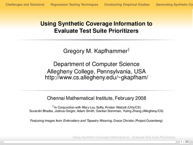 Synthetic Cov Coverage Overlap Metrics T1 R1 R2 R3 T2 R4 R5 R6 T3 R7 R8 R9 T4 NCO(i, k) = (R \ covers(i)) ∩ (R \ covers(k)) NCO(1, 2) = {R7 , R8 , R9 } JCO(i, k) = covers(i) ∩ covers(k) JCO(1, 2) = {R2 , R3 , R4 } TCO(i, k) = NCO(i, k) ∪ JCO(i, k) TCO(1, 2) = {R2 , R3 , R4 , R7 , R8 , R9 } 19 / 36 Using Synthetic Coverage Information to , Evaluate Test Suite Prioritizers