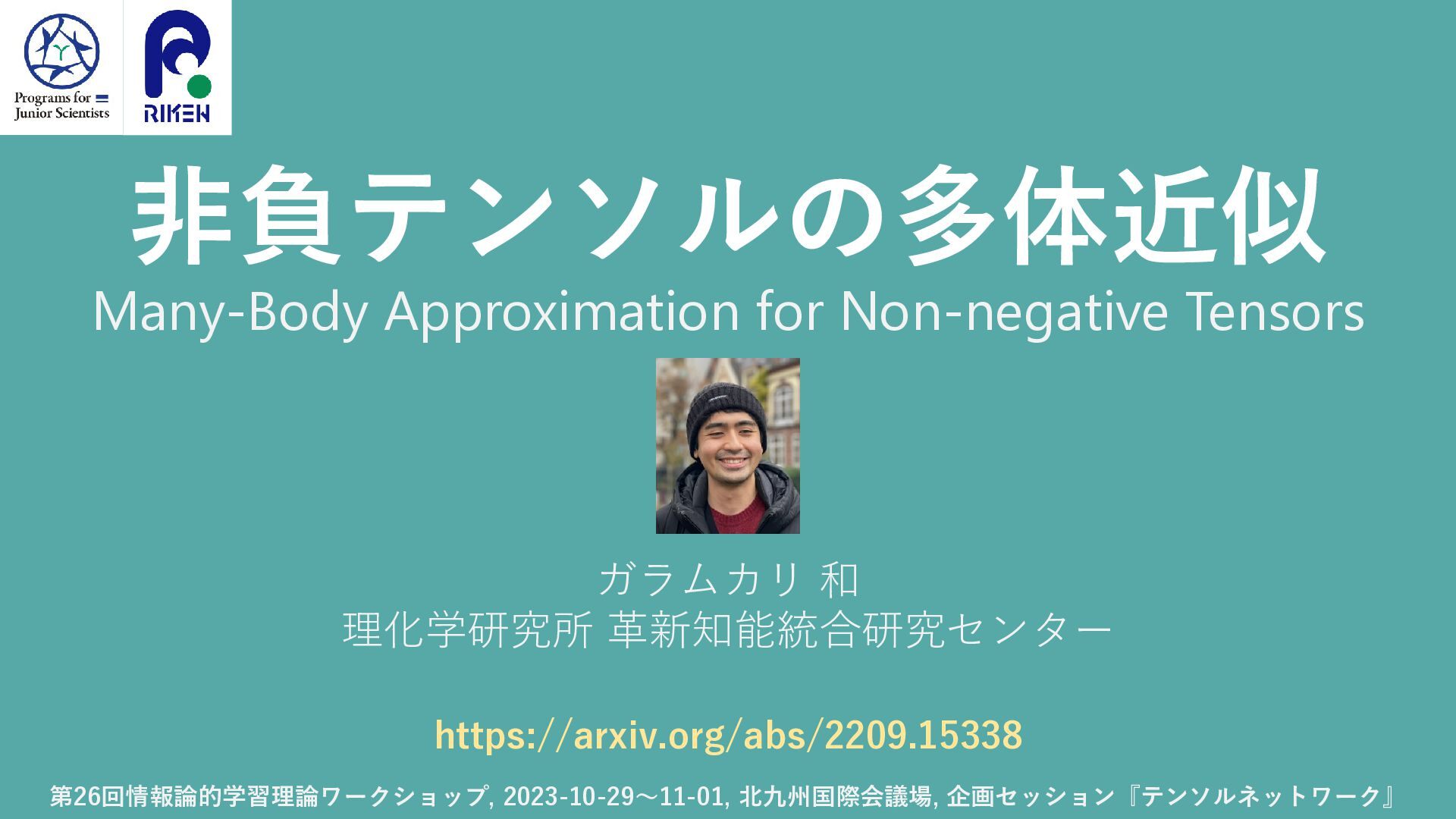 非負テンソルの多体近似 理化学研究所 革新知能統合研究センター https://arxiv.org/abs/2209.15338 ガラムカリ 和 第26回情報論的学習理論ワークショップ, 2023-10-29〜11-01, 北九州国際会議場, 企画セッション『テンソルネットワーク』