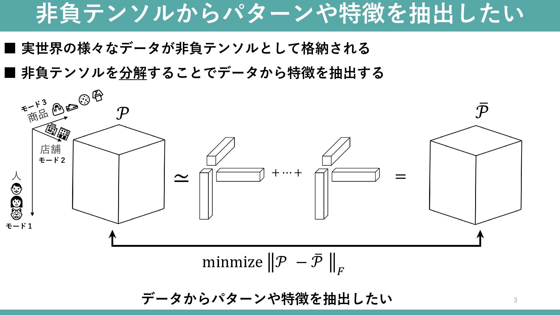 𝒫 minmize 𝒫 − ത 𝒫 𝐹 + ⋯ + 𝒫 ▪ 実世界の様々なデータが非負テンソルとして格納される データからパターンや特徴を抽出したい ▪ 非負テンソルを分解することでデータから特徴を抽出する モード2 モード1