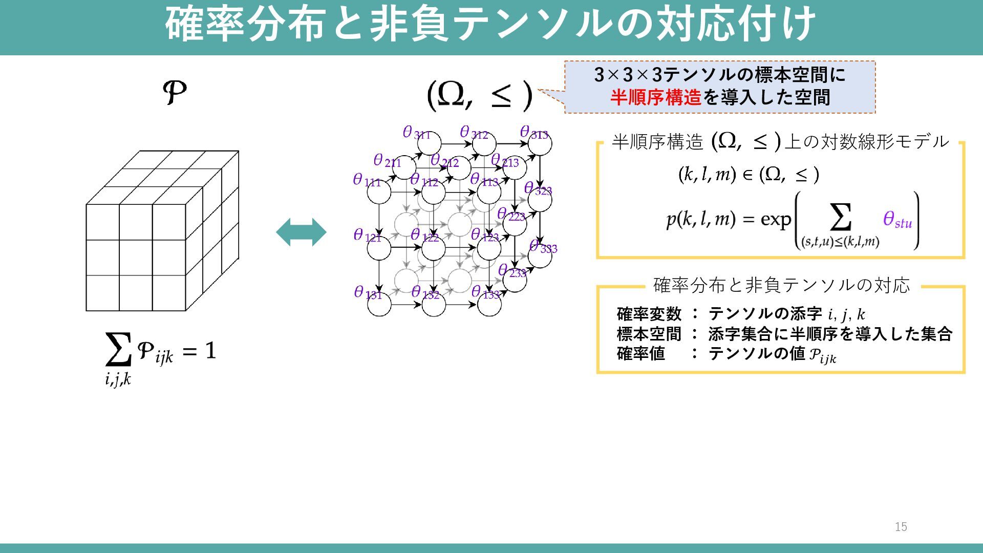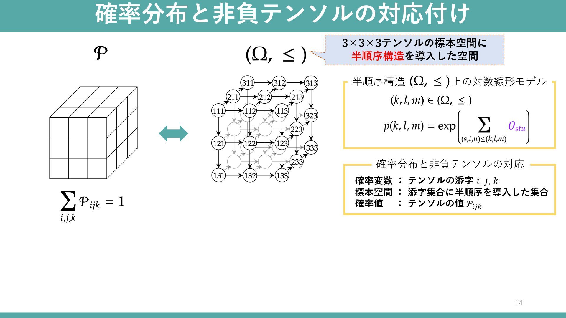 : 添字集合に半順序を導入した集合 : テンソルの値 𝒫𝑖𝑗𝑘 半順序構造 上の対数線形モデル 確率分布と非負テンソルの対応 3×3×3テンソルの標本空間に 半順序構造を導入した空間