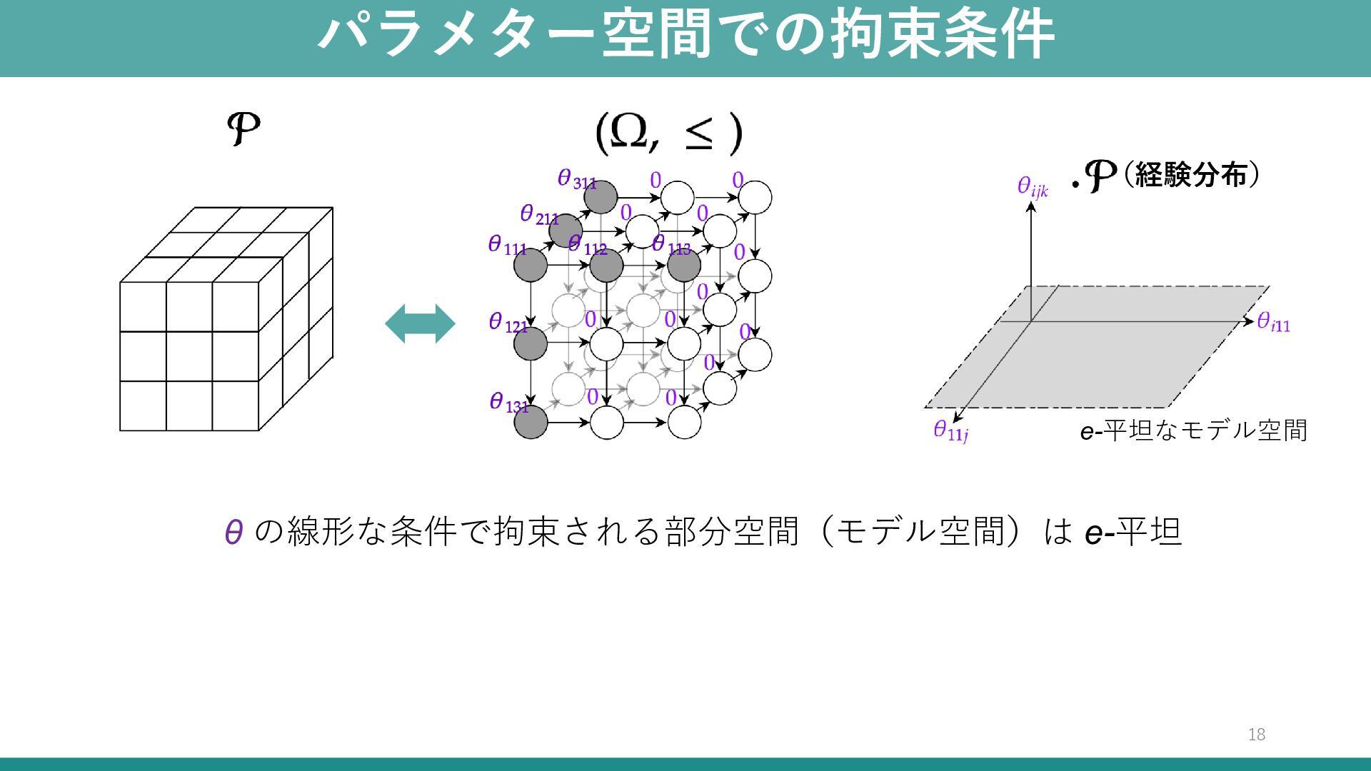パラメター空間での拘束条件 18 (経験分布) θ の線形な条件で拘束される部分空間(モデル空間)は e-平坦 e-平坦なモデル空間