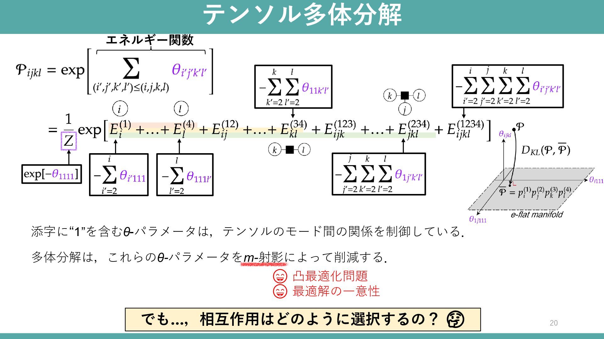 テンソル多体分解 20 添字に“1”を含むθ-パラメータは,テンソルのモード間の関係を制御している. 多体分解は,これらのθ-パラメータをm-射影によって削減する. 😄 凸最適化問題 😄 最適解の一意性 エネルギー関数 でも…,相互作用はどのように選択するの?