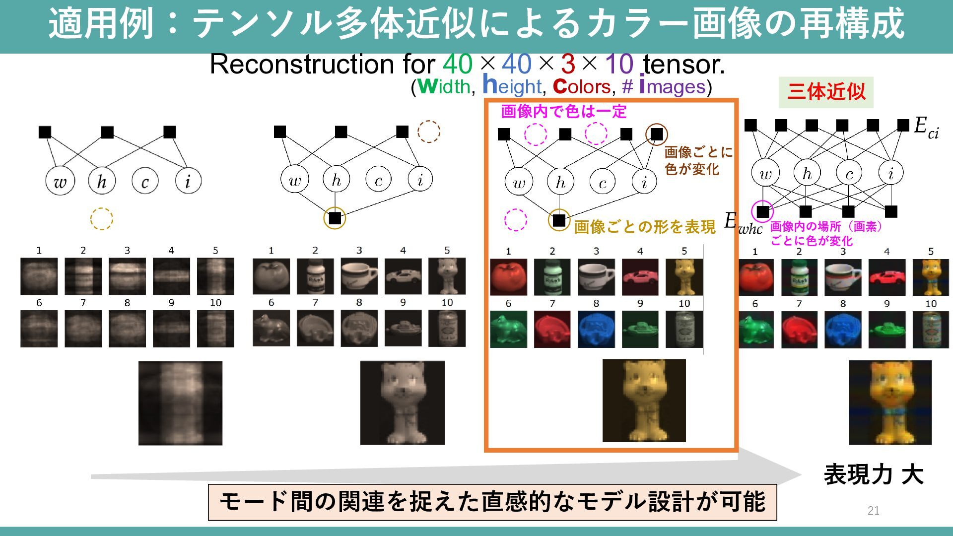 適用例:テンソル多体近似によるカラー画像の再構成 表現力 大 Reconstruction for 40×40×3×10 tensor. (width, height, colors,