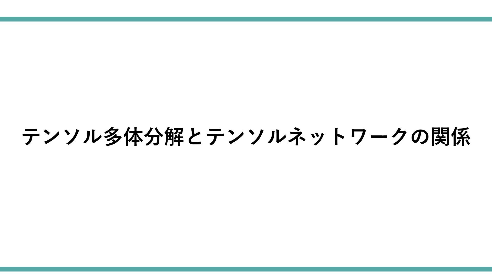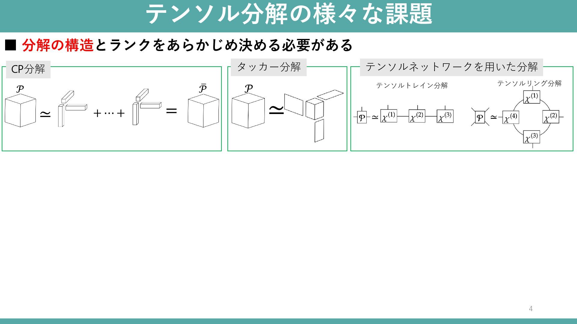 ≃ タッカー分解 テンソルネットワークを用いた分解 + ⋯ + テンソルトレイン分解 テンソルリング分解 𝒫