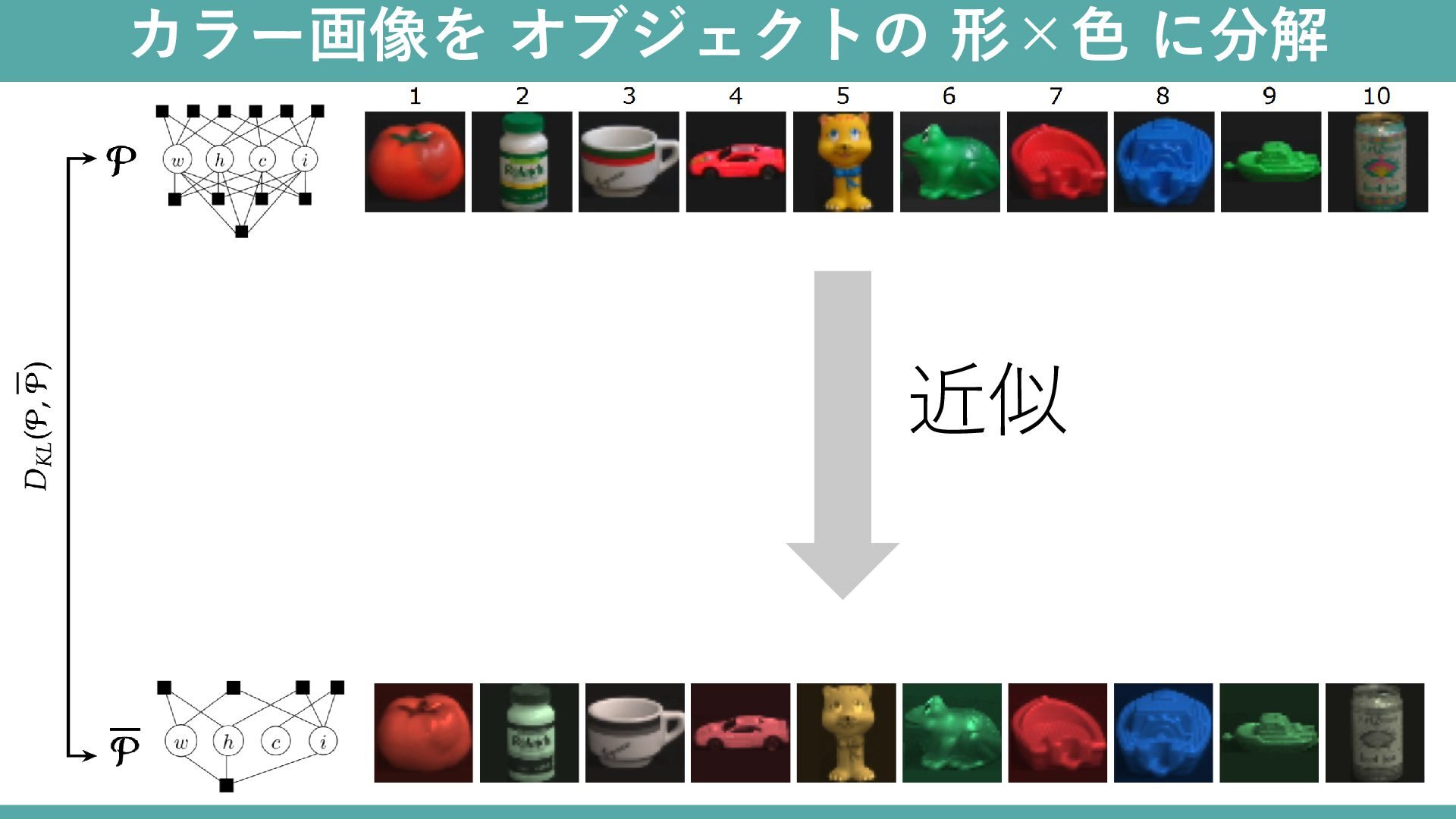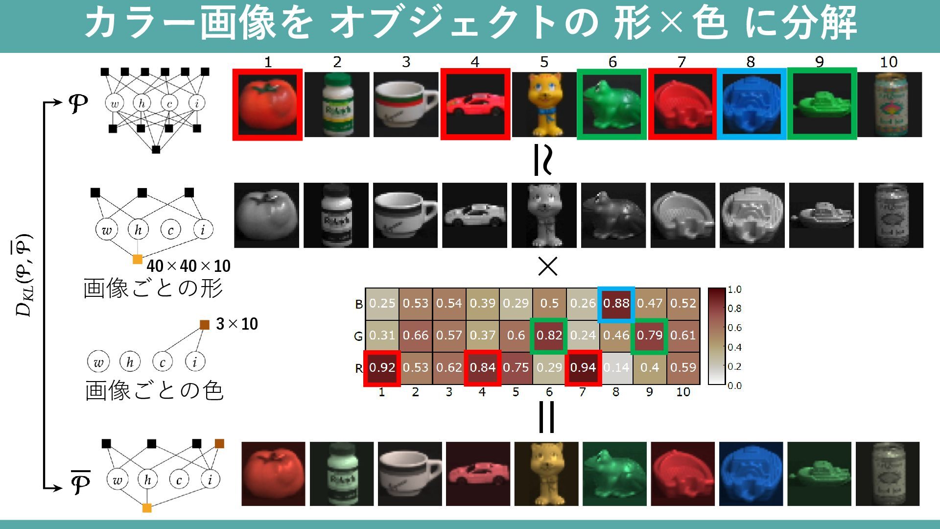 カラー画像を オブジェクトの 形×色 に分解 × ≃ = 画像ごとの形 画像ごとの色 3×10
