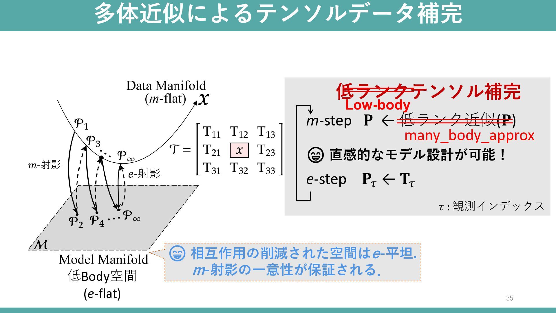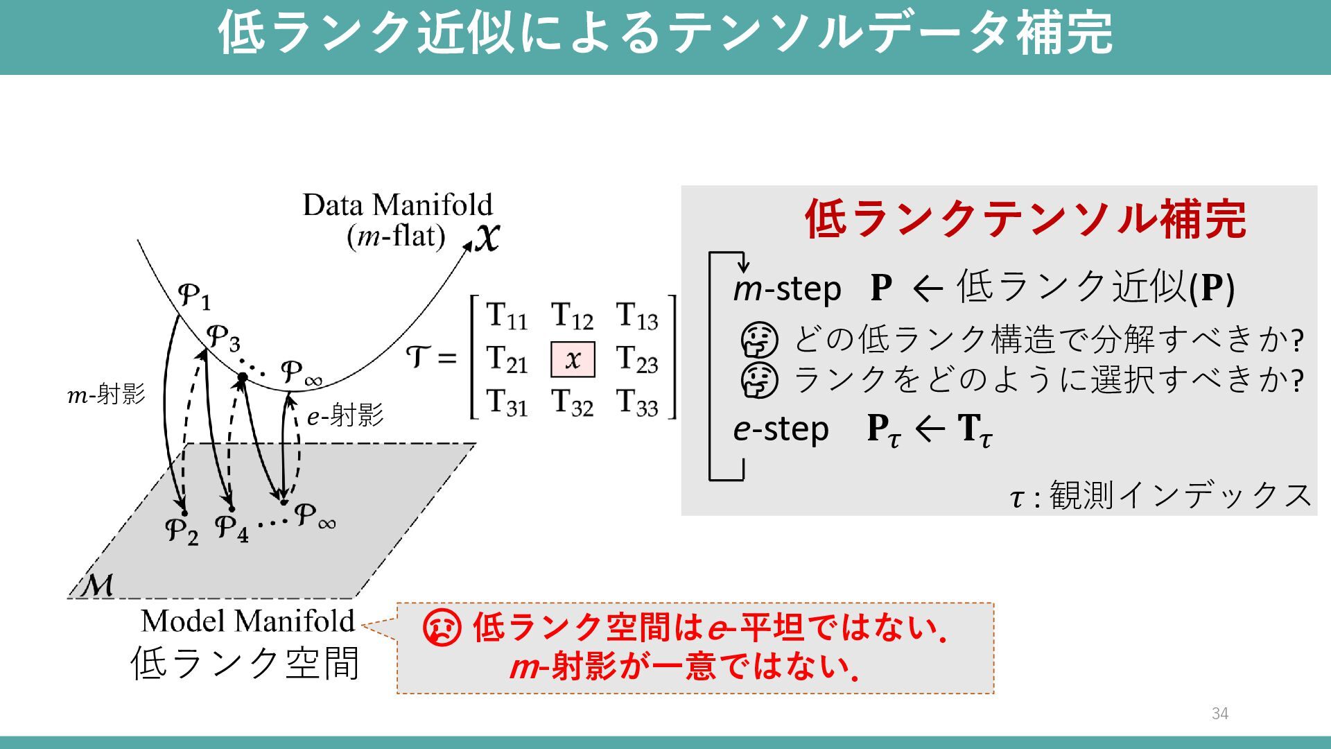 : 観測インデックス 低ランクテンソル補完 😢 低ランク空間はe-平坦ではない. m-射影が一意ではない. 🤔 どの低ランク構造で分解すべきか? 🤔 ランクをどのように選択すべきか? 低ランク空間 34 𝑒-射影 𝑚-射影