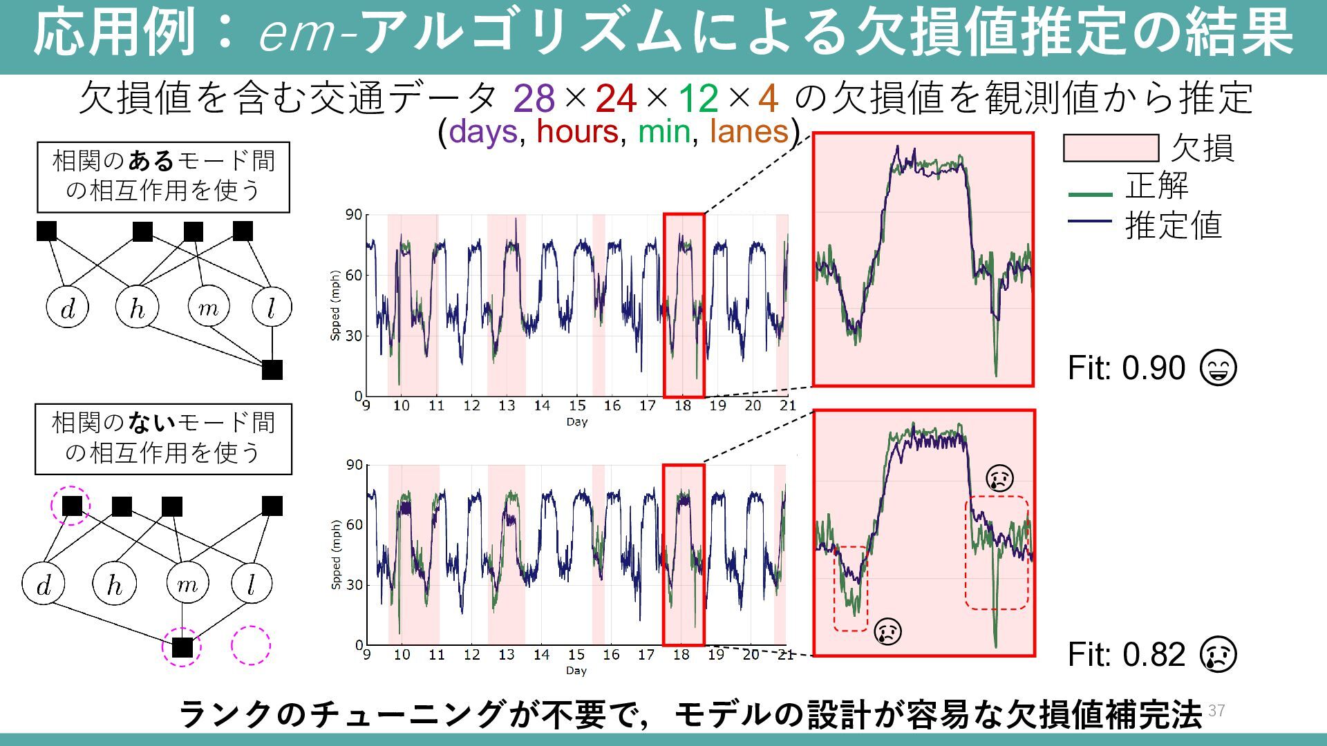 欠損値を含む交通データ 28×24×12×4 の欠損値を観測値から推定 (days, hours, min, lanes) 相関のないモード間 の相互作用を使う Fit: 0.82 😢 😢 😢 ランクのチューニングが不要で,モデルの設計が容易な欠損値補完法