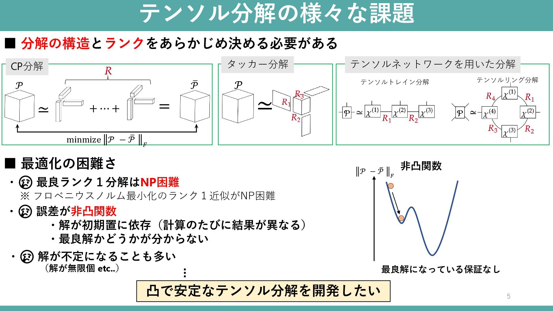 ▪ 最適化の困難さ ・😢 最良ランク1分解はNP困難 ≃ タッカー分解 テンソルネットワークを用いた分解 + ⋯ + 凸で安定なテンソル分解を開発したい minmize 𝒫 − ത 𝒫 𝐹 ※ フロベニウスノルム最小化のランク1近似がNP困難 非凸関数 𝒫 − ത 𝒫 𝐹 (解が無限個 etc..) … ・😢 解が不定になることも多い ・😢 誤差が非凸関数 ・解が初期置に依存(計算のたびに結果が異なる) ・最良解かどうかが分からない 最良解になっている保証なし テンソルトレイン分解 テンソルリング分解 𝒫