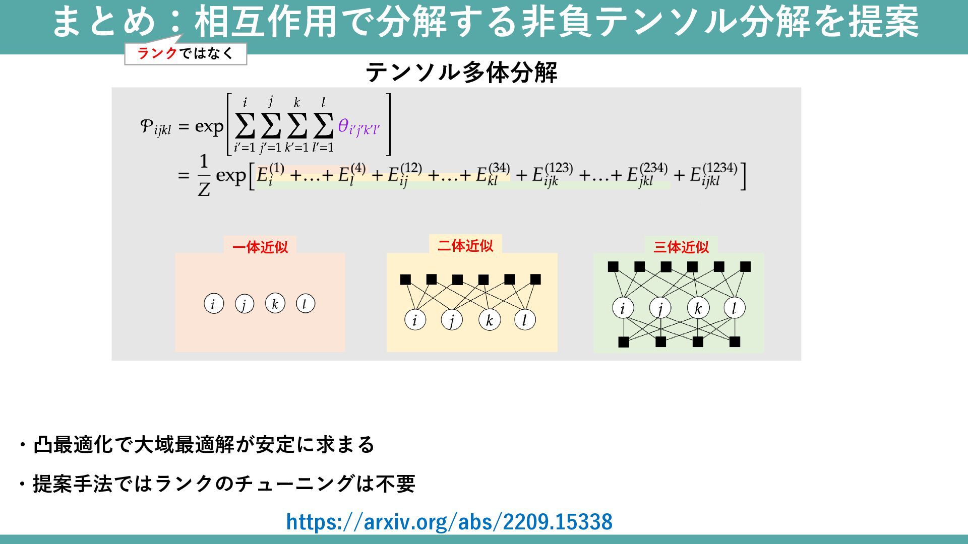 まとめ:相互作用で分解する非負テンソル分解を提案 ランクではなく https://arxiv.org/abs/2209.15338 ・提案手法ではランクのチューニングは不要 一体近似 三体近似 二体近似 テンソル多体分解 ・凸最適化で大域最適解が安定に求まる