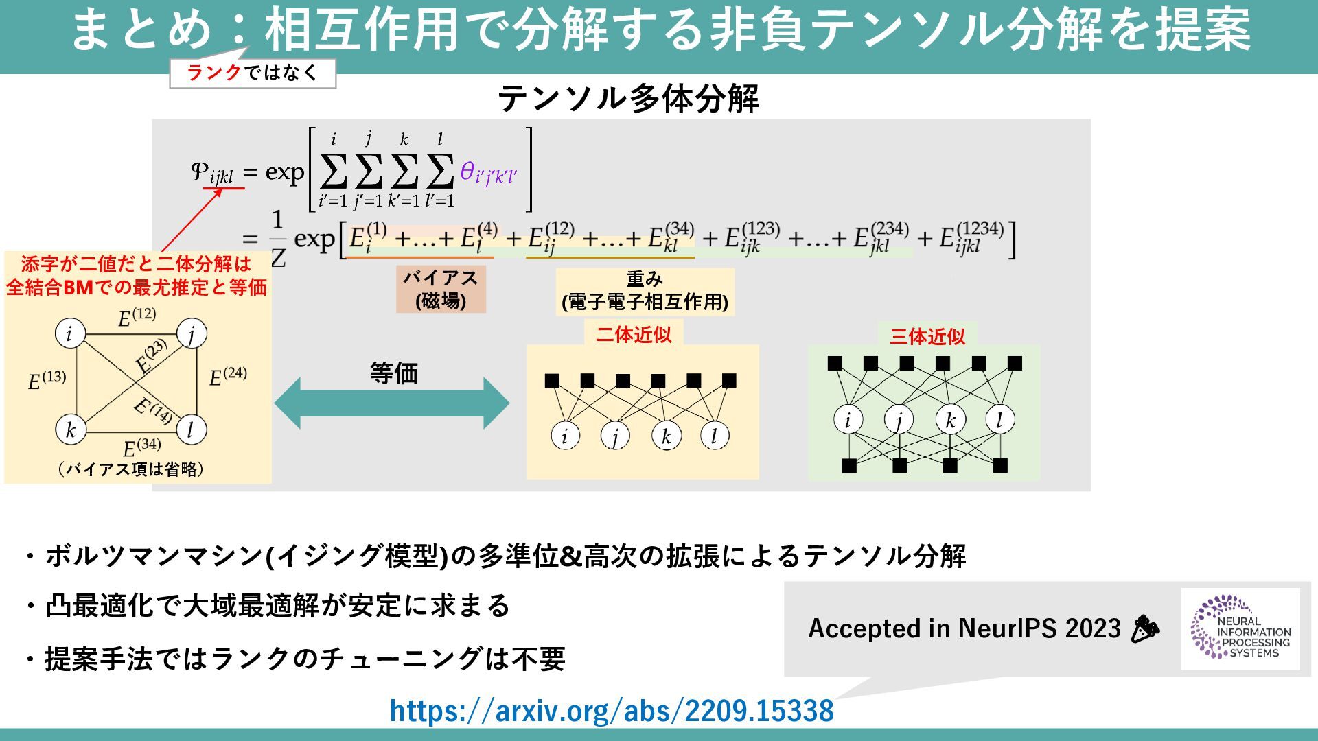 等価 ・提案手法ではランクのチューニングは不要 ・凸最適化で大域最適解が安定に求まる ・ボルツマンマシン(イジング模型)の多準位&高次の拡張によるテンソル分解 Accepted in NeurIPS 2023 🎉 https://arxiv.org/abs/2209.15338 まとめ:相互作用で分解する非負テンソル分解を提案 ランクではなく