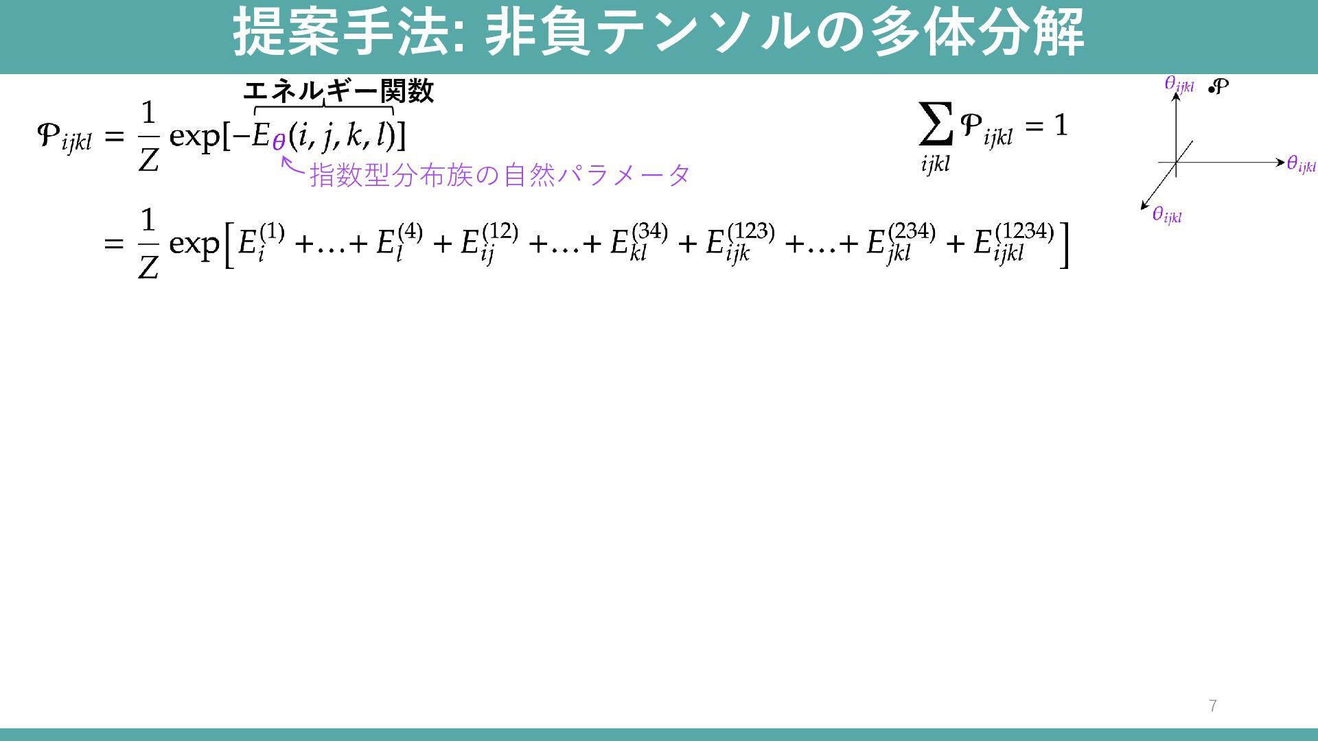 提案手法: 非負テンソルの多体分解 6 指数型分布族の自然パラメータ エネルギー関数 規格化定数