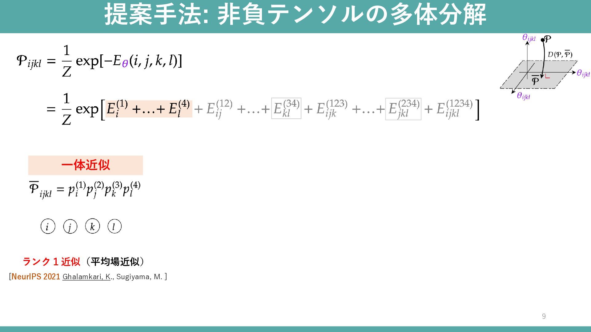 提案手法: 非負テンソルの多体分解 9 一体近似 ランク1近似(平均場近似) [NeurIPS 2021 Ghalamkari, K., Sugiyama,