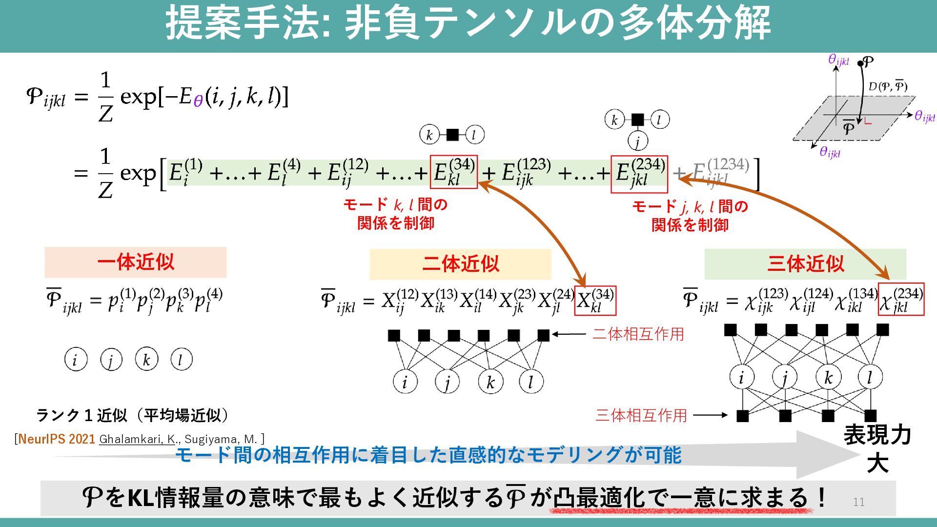 モード j, k, l 間の 関係を制御 モード k, l 間の 関係を制御 三体相互作用 ランク1近似(平均場近似) [NeurIPS 2021 Ghalamkari, K., Sugiyama, M. ] をKL情報量の意味で最もよく近似する が凸最適化で一意に求まる! 11