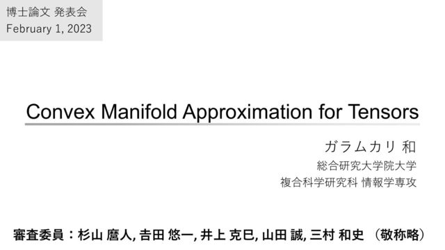 ∈ に次の関係があるときに, を半順序集合と呼ぶ. (1)反射律: 𝑠1 ≤ 𝑠1 (2)反対称律: 𝑠1 ≤ 𝑠2 , 𝑠2 ≤ 𝑠1 ⇒ 𝑠1 = 𝑠2 (3)推移律:𝑠1 ≤ 𝑠2 , 𝑠2 ≤ 𝑠3 ⇒ 𝑠1 ≤ 𝑠3 □ 半順序集合 上の対数線形モデル 写像𝑝: → 0,1 として,順序集合 上の対数線形モデルを定義する.自然パラメータ𝜽で分布が定まる. 𝜃空間 𝜂空間 メビウス関数𝜇を用いて,期待値パラメータ𝜼で分布を定めることもできる. Sugiyama, M., Nakahara, H., & Tsuda, K. Tensor balancing on statistical manifold. ICML2017 14 メビウス関数 入力のデータ構造 半順序集合上の対数線形モデル