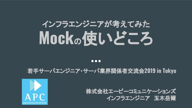 インフラエンジニアが考えてみた Mockの 使いどころ 若手サーバエンジニア・サーバ業界関係者交流会2019 in Tokyo 株式会社エーピーコミュニケーションズ インフラエンジニア 玉木岳爾