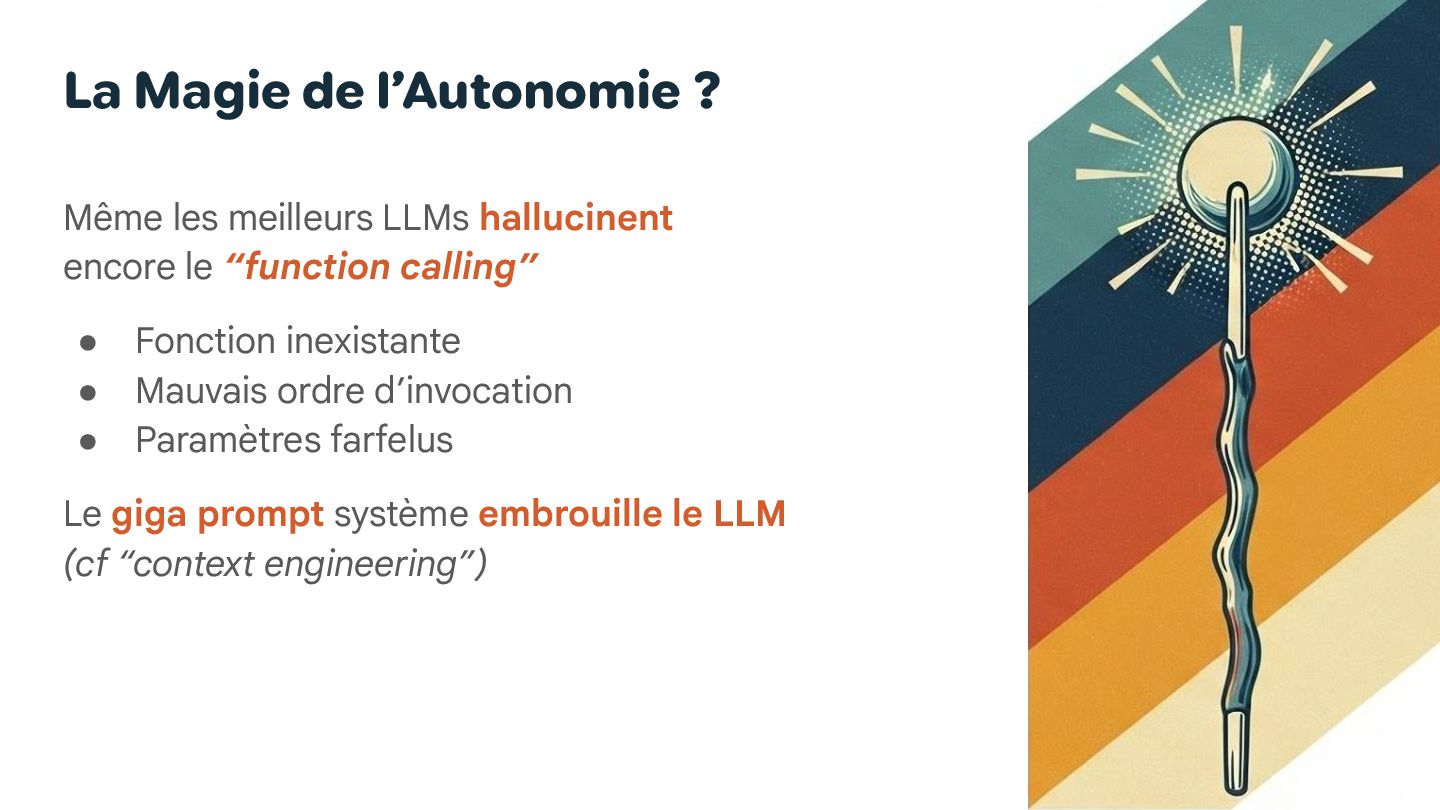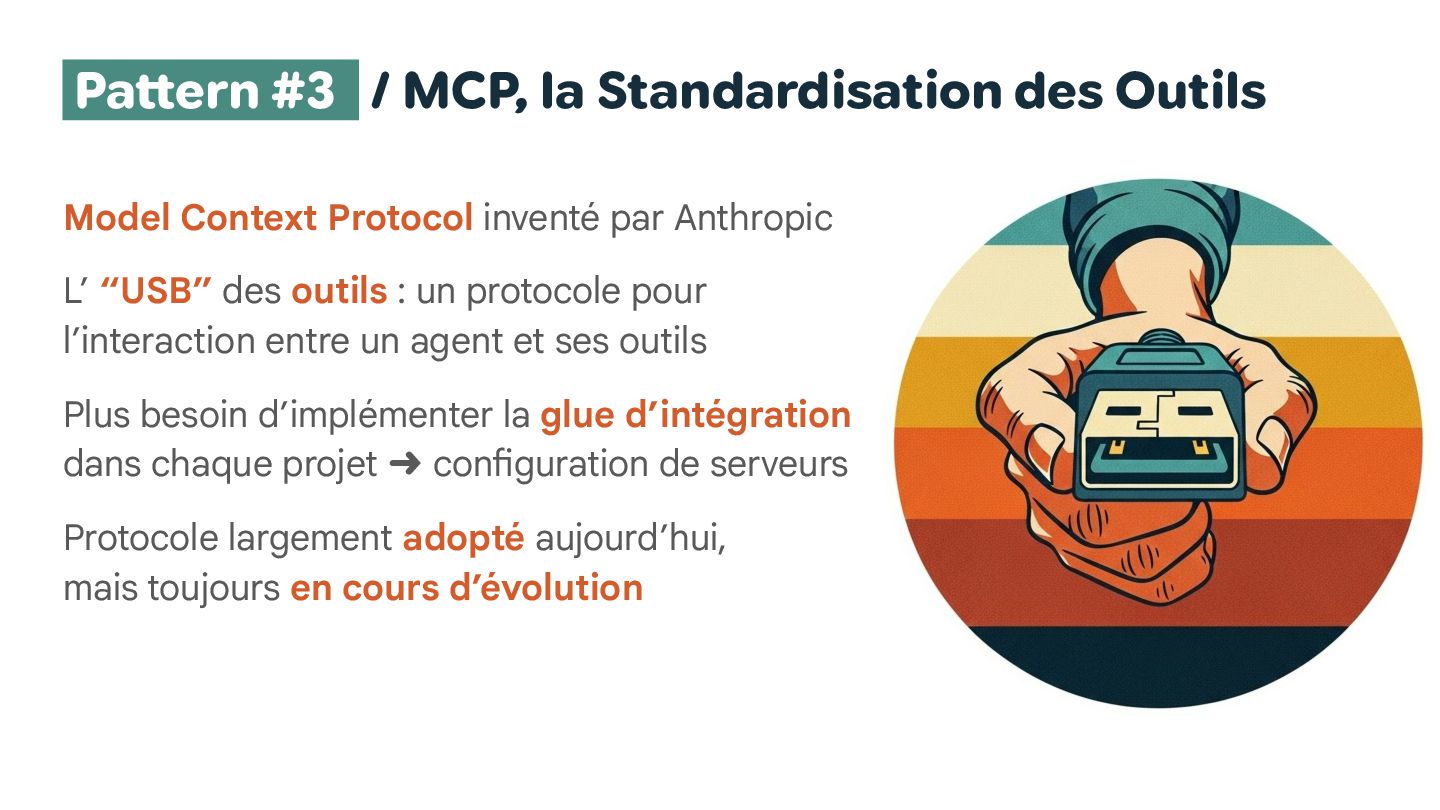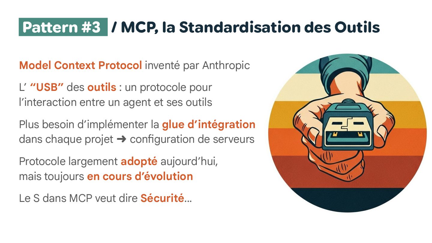 Buzzword de 2025, les agents IA ont fait couler beaucoup d’octets. Nous verrons ensemble les ingrédients clés de la recette : les modèles qui raisonnent, les outils et protocoles utilisés (function calling et MCP), comment orchestrer des agents ensemble (ADK, A2A), en passant par les patterns importants.