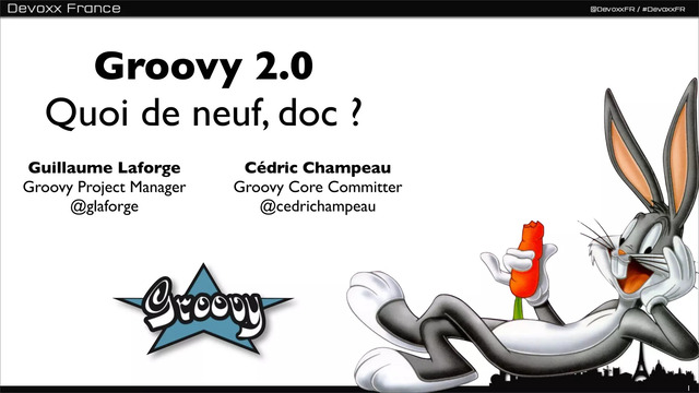 Presentation on Groovy 1.8 and 2.0 given by Guillaume Laforge and Cédric Champeau during Devoxx France 2012
