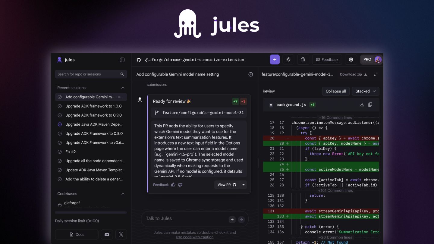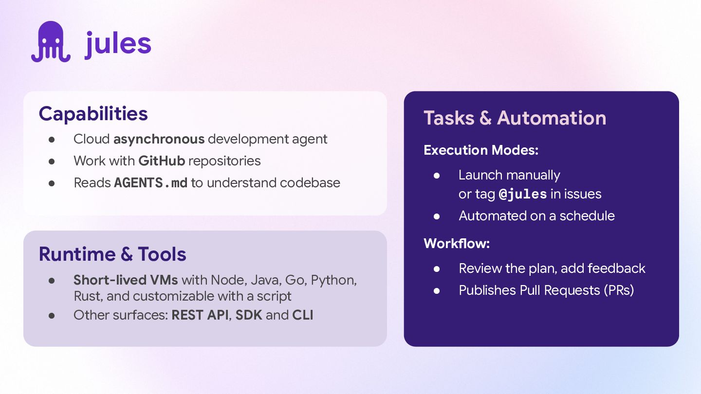 Next is Jules, a coding agent that lives in the cloud. You can assign Jules boring tasks (fixing bugs or updating tests) and it will work in the background to send you a Pull Request when it is finished.